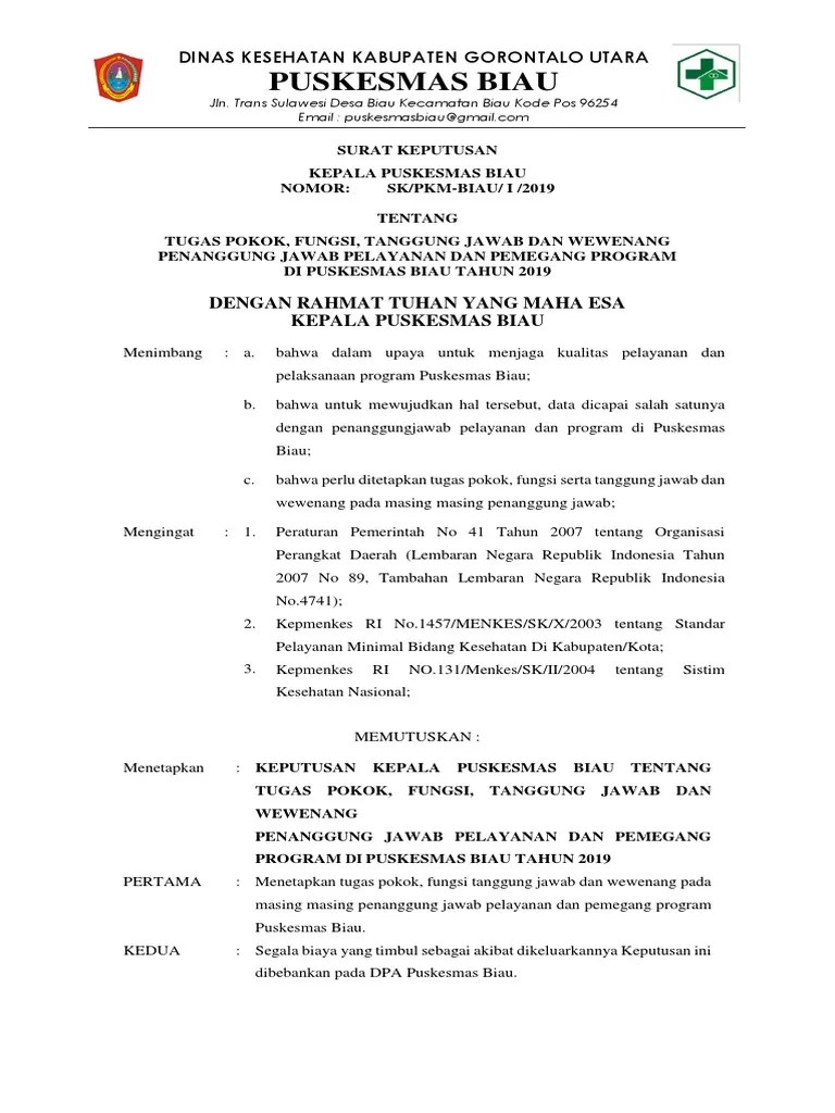 Penanggung jawab ukm program kesehatan lingkungan puskemas saripoi. Keputusan menteri kesehatan nomor 1428/menkes/sk/xii/2006 tentang pedoman penyelenggaraan kesehatan lingkungan puskesmas, sepanjang yang . Kepala badan pengelola keuangan daerah kota kotamobagu. 1.3.1.a sk penilaian kinerja oleh kepala puskesmas dan penanggung jawab upaya.doc. Kepala upt puskesmas tarusan tentang penetapan tim.